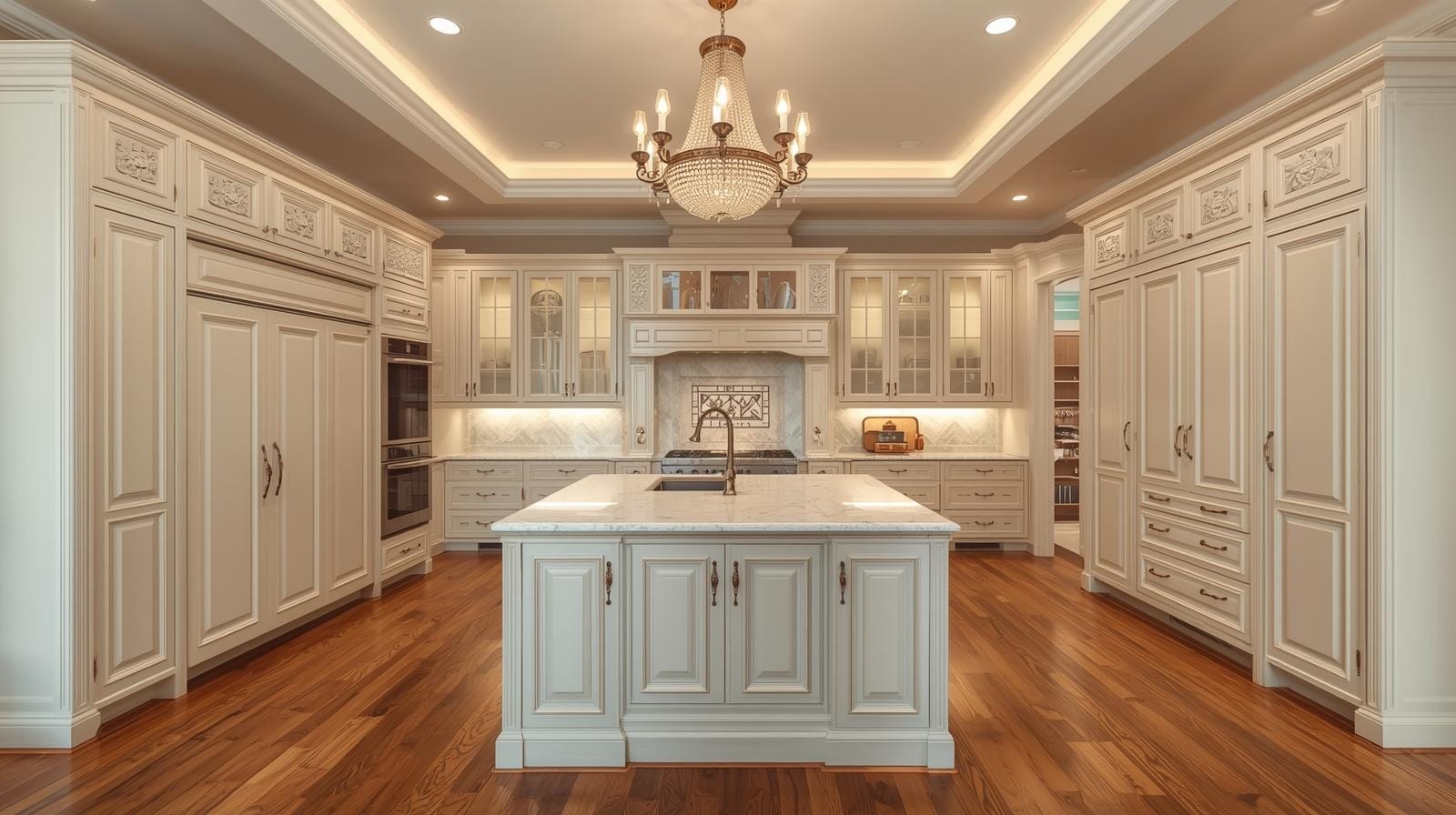 Nhà hàng, khách sạn: tủ bếp gỗ sồi sơn màu, phong cách tân cổ điển để tạo sự sang trọng.
