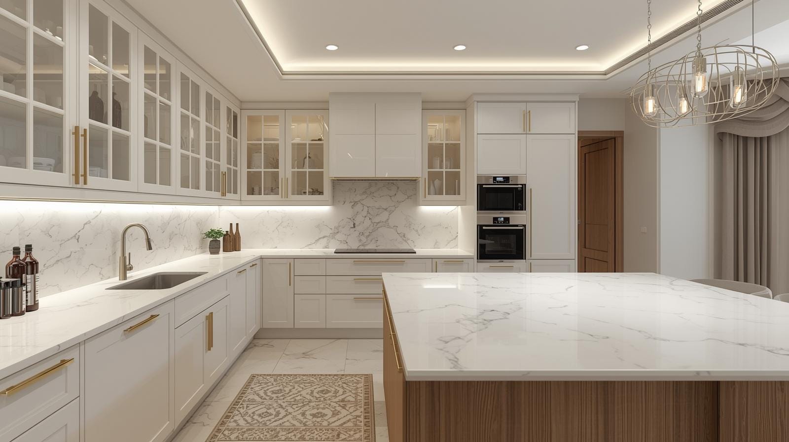Thi công đồng bộ: Tủ bếp, mặt đá, kính ốp, đèn LED.