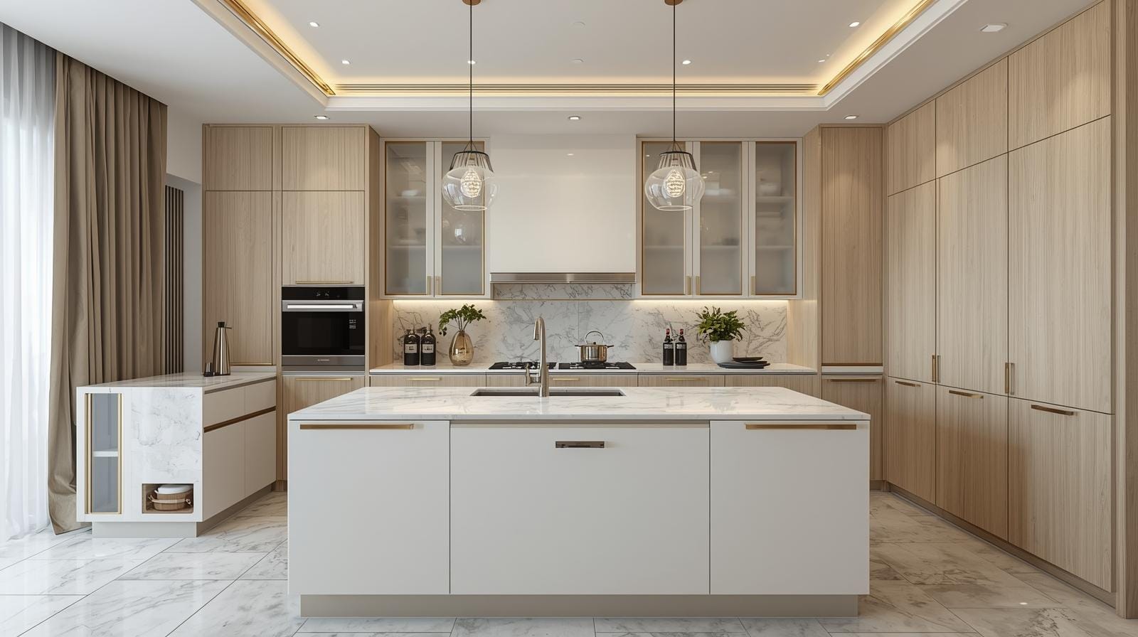 Tích hợp phụ kiện thông minh: Giá nâng hạ, tủ kho, ray trượt giảm chấn, đèn LED cảm biến.
