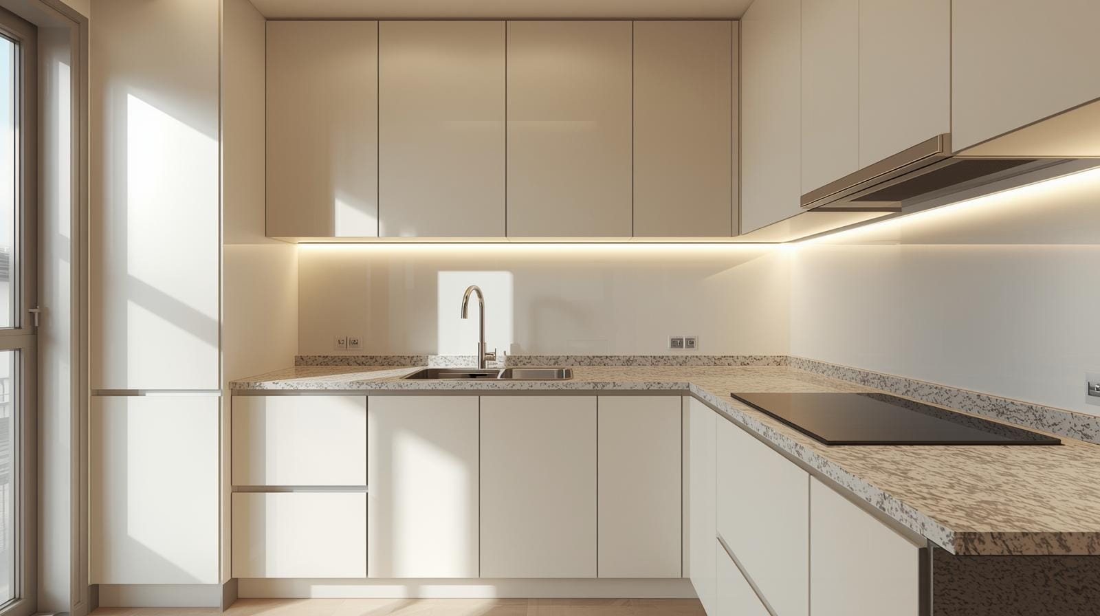 Tủ bếp chữ L: Tận dụng góc, tăng diện tích lưu trữ, thuận tiện di chuyển khi nấu ăn.