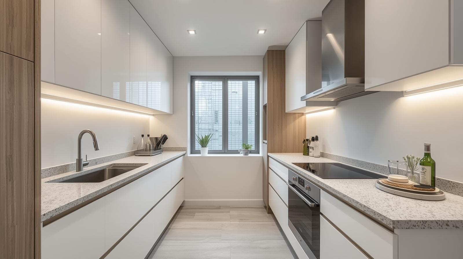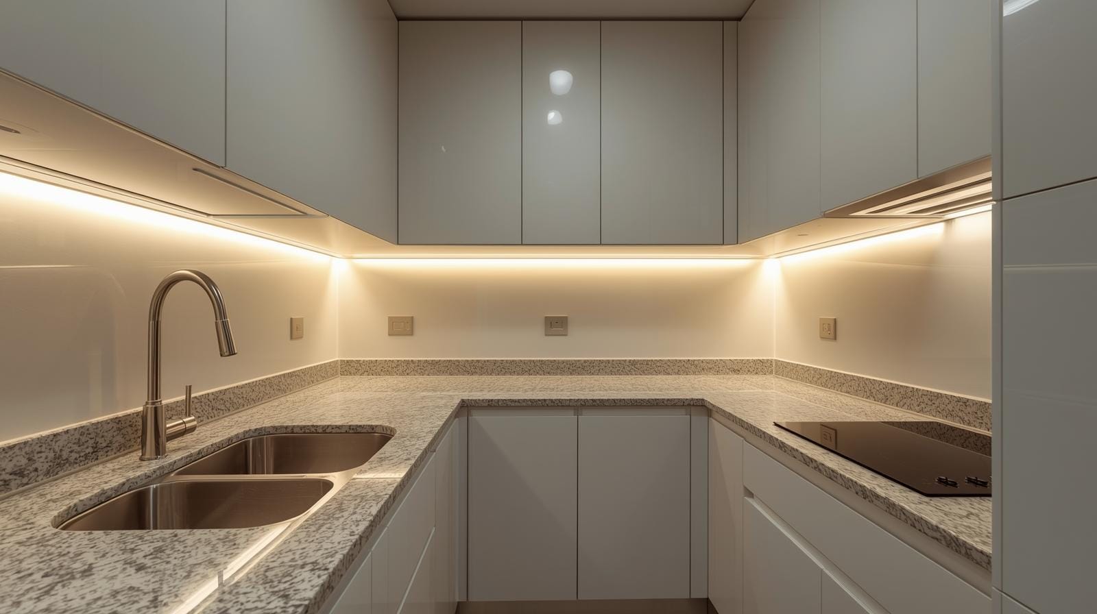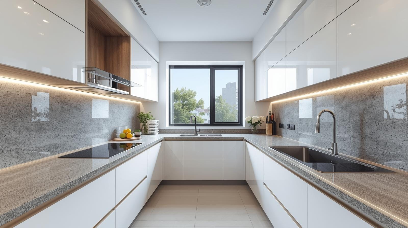 Thi công đồng bộ: Bao gồm cả mặt đá bếp, kính ốp tường, hệ thống đèn LED.