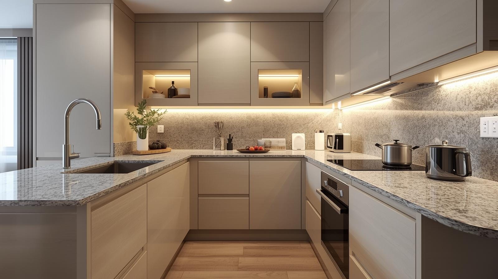 Tủ bếp chữ U: Dành cho căn hộ rộng hơn, tạo không gian bếp chuyên nghiệp.