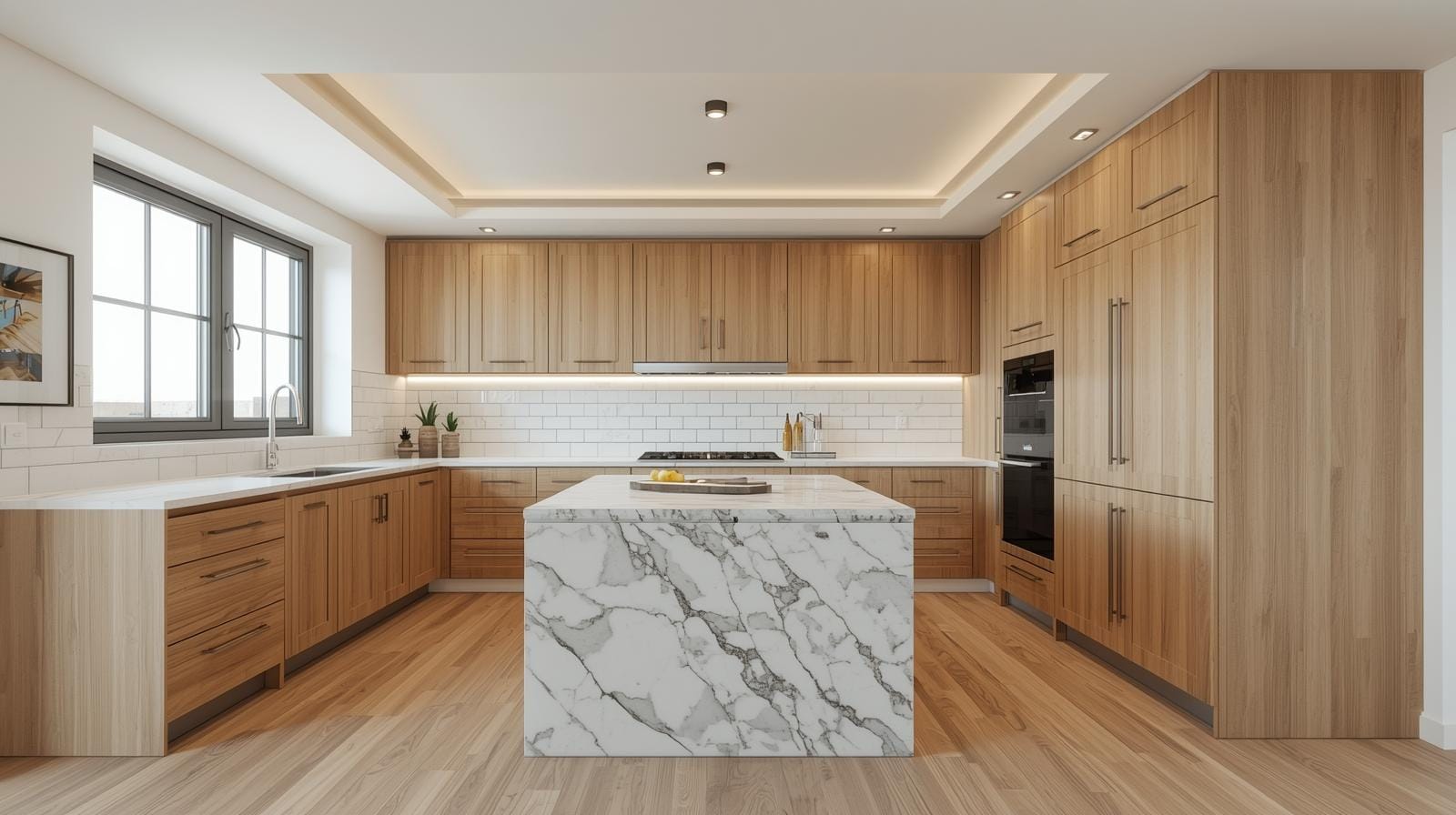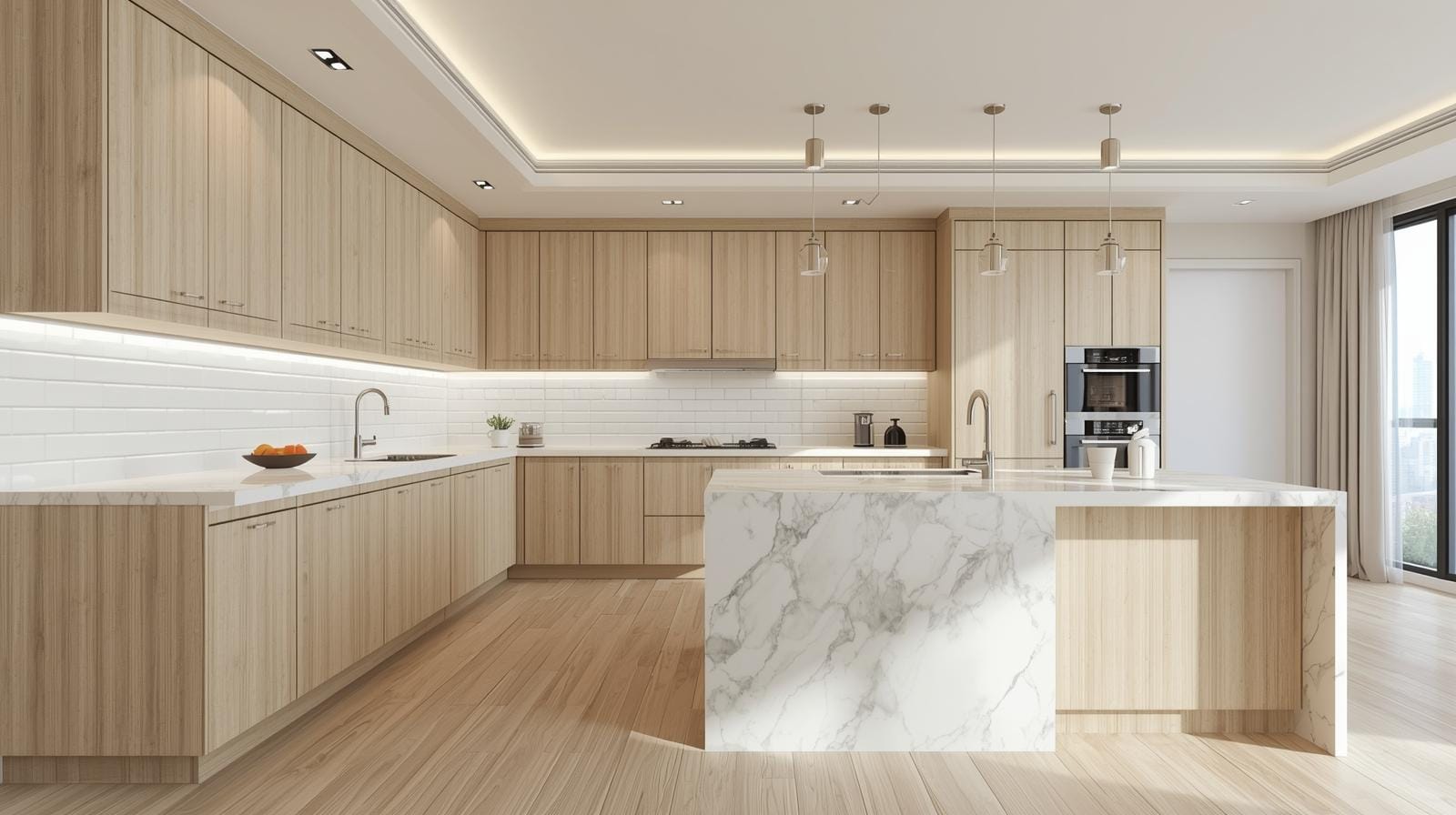 Kiểu dáng U hoặc có bàn đảo, kết hợp mặt đá marble, granite.