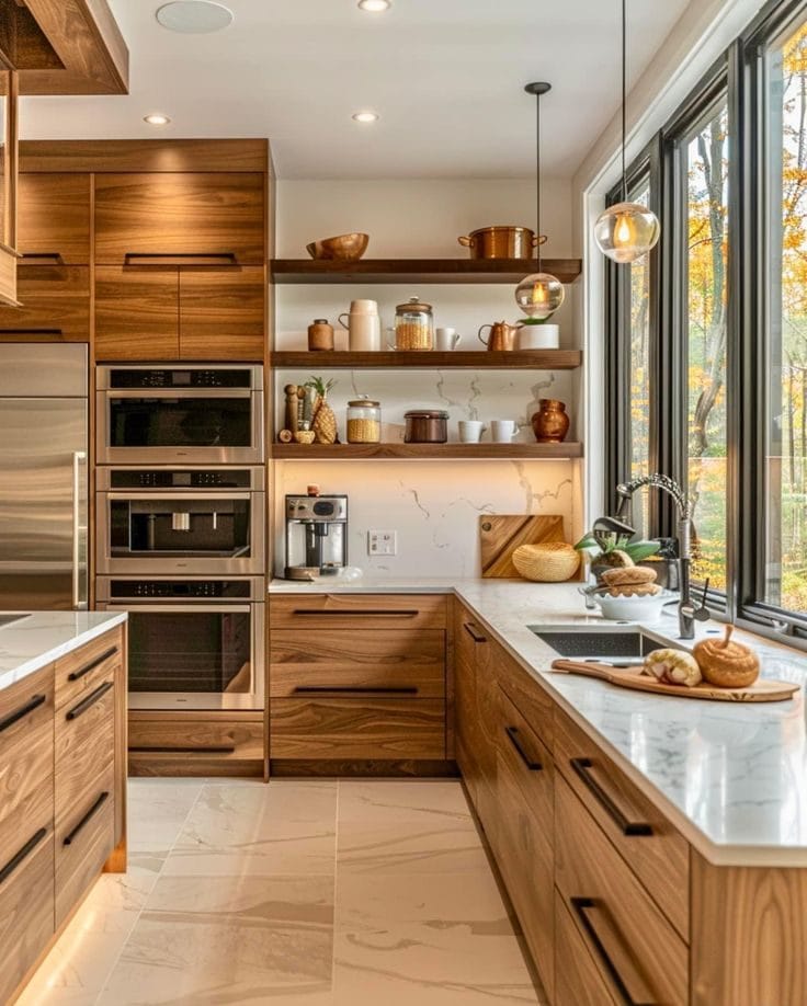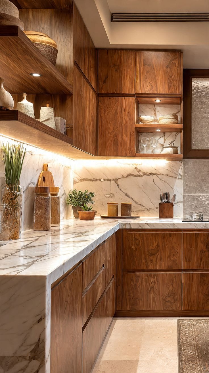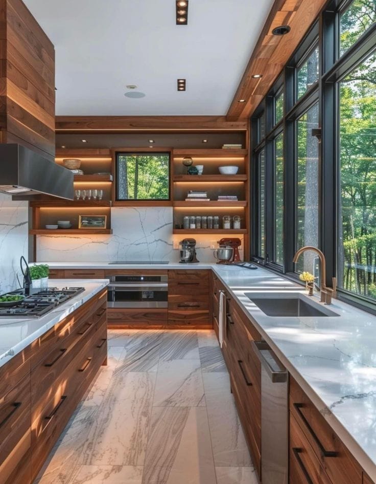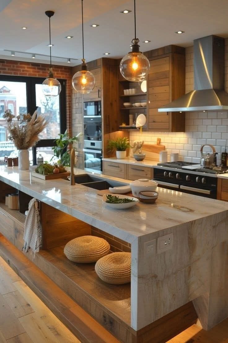 Bên cạnh đó, thiết kế nội thất bếp gỗ còn có thể kết hợp cùng nhiều vật liệu hiện đại như đá tự nhiên, kính cường lực hay kim loại để tạo nên phong cách sang trọng và tiện nghi hơn. Sự kết hợp này giúp căn bếp không chỉ là nơi nấu ăn mà còn trở thành không gian sinh hoạt chung đầy cảm hứng của gia đình.