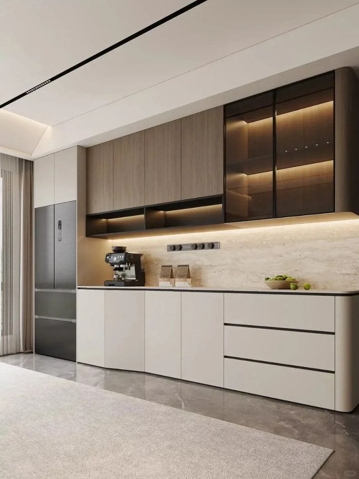 Về mặt thẩm mỹ, tủ bếp chữ I có thể được thiết kế theo nhiều phong cách khác nhau như hiện đại, tối giản hoặc sang trọng tùy theo vật liệu và màu sắc sử dụng. Các chất liệu phổ biến gồm gỗ công nghiệp MDF chống ẩm, gỗ tự nhiên, acrylic bóng gương, laminate hoặc melamine. Sự đa dạng này giúp gia chủ dễ dàng lựa chọn mẫu tủ phù hợp với tổng thể nội thất của ngôi nhà.